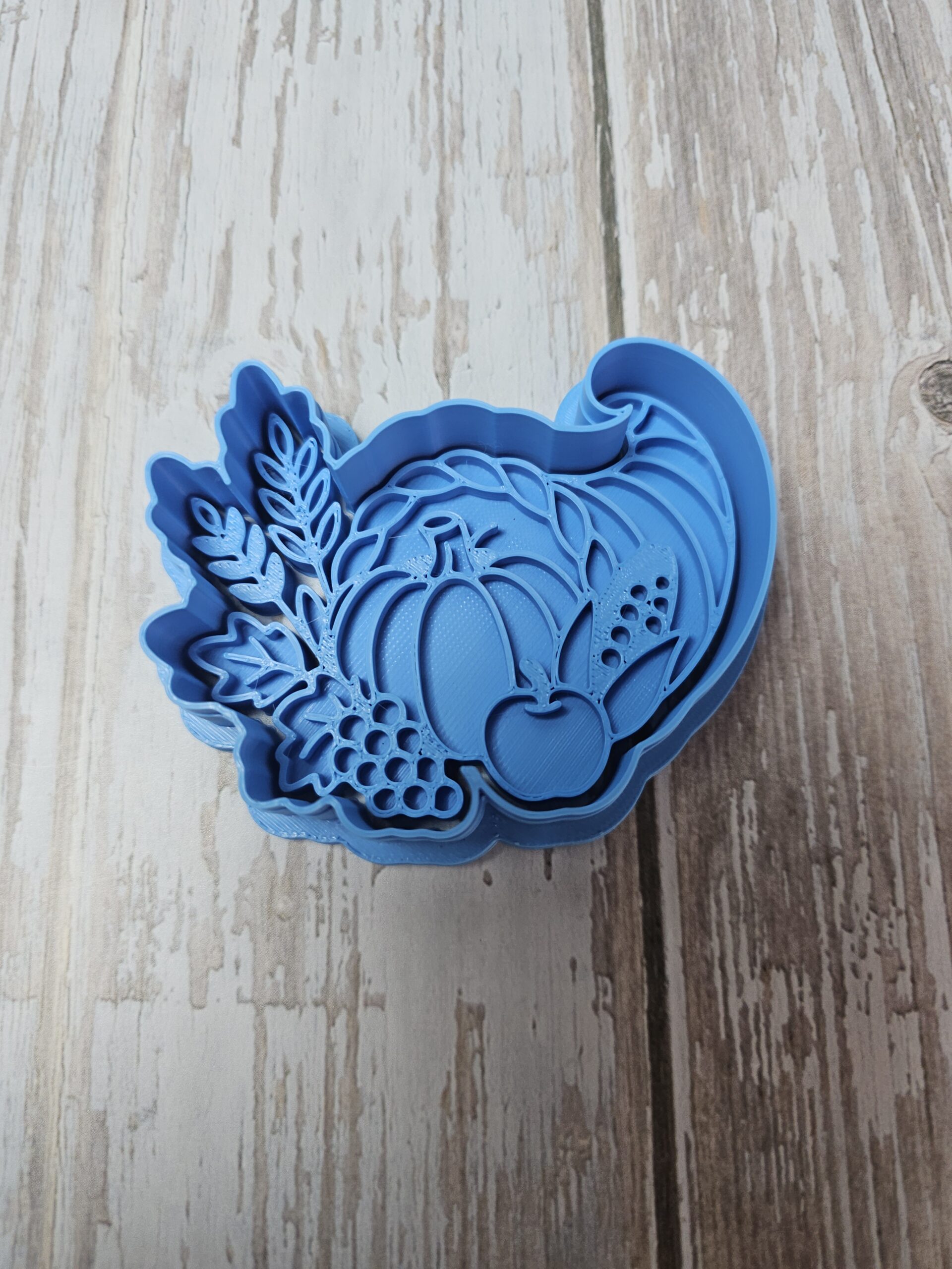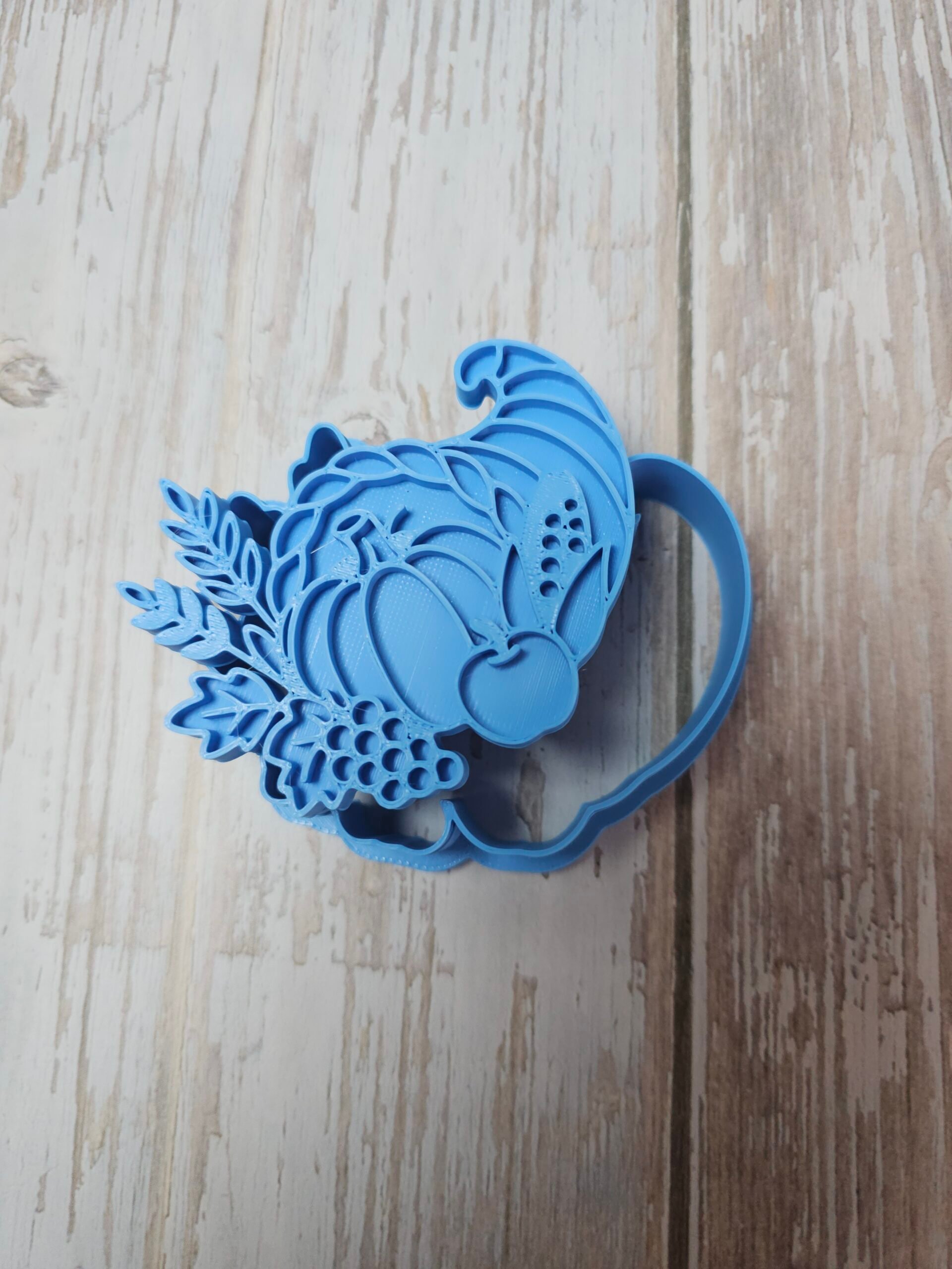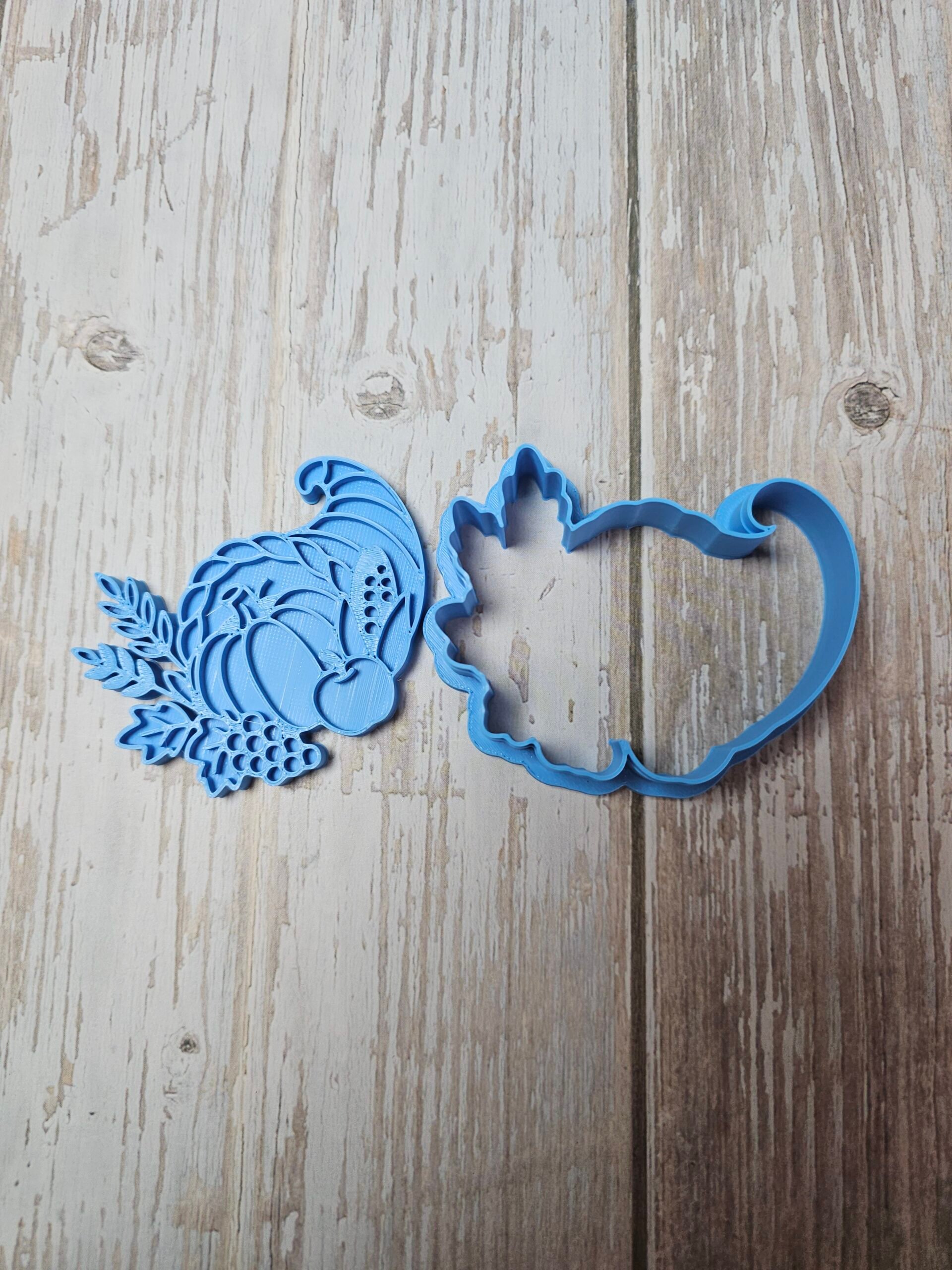 Celebrate abundance and gratitude with this Cornucopia Cookie Cutter & Stamp. Featuring a detailed horn of plenty filled with fruits and leaves, this design is perfect for Thanksgiving cookie sets, autumn gatherings, and festive baking projects.