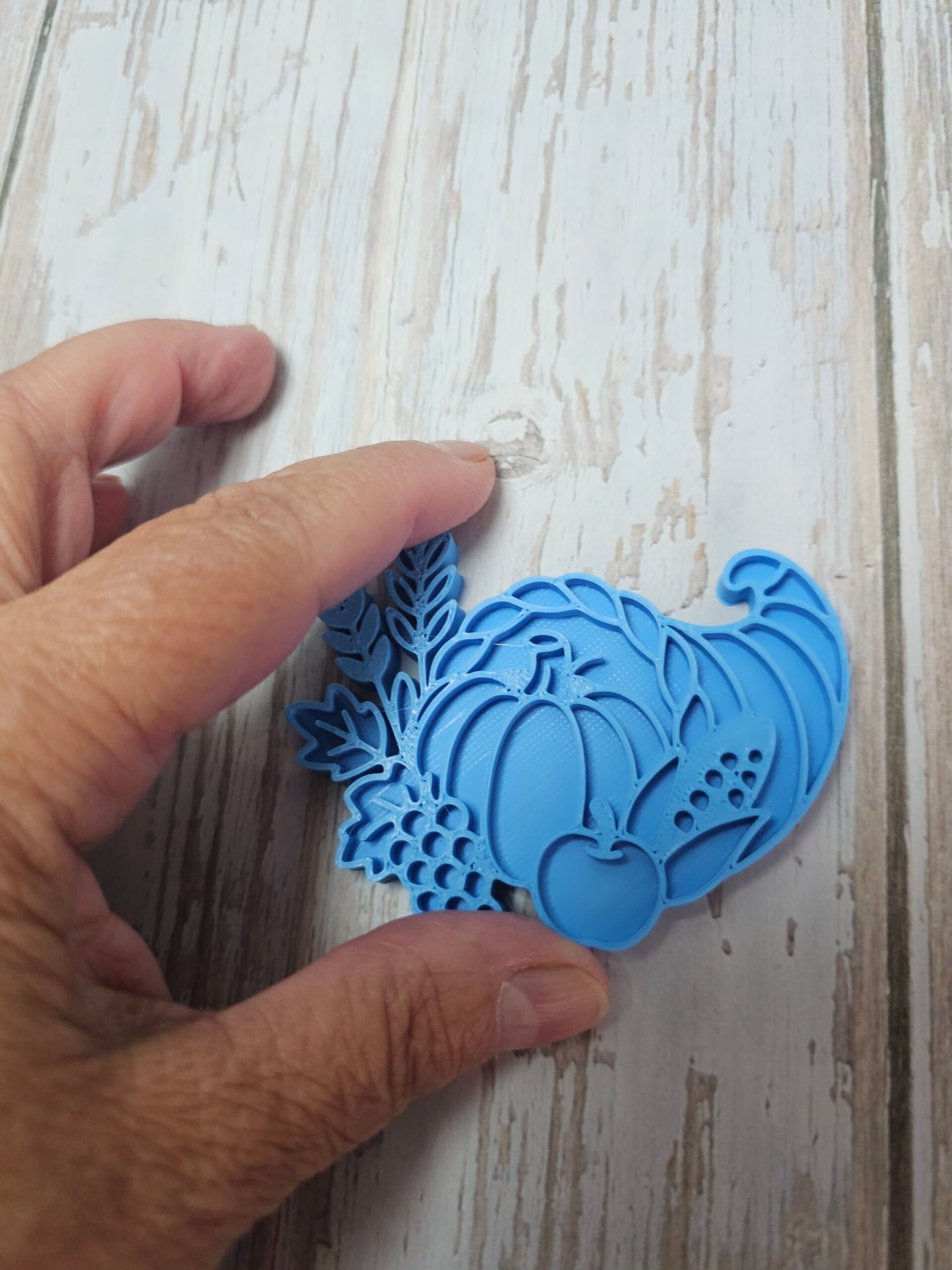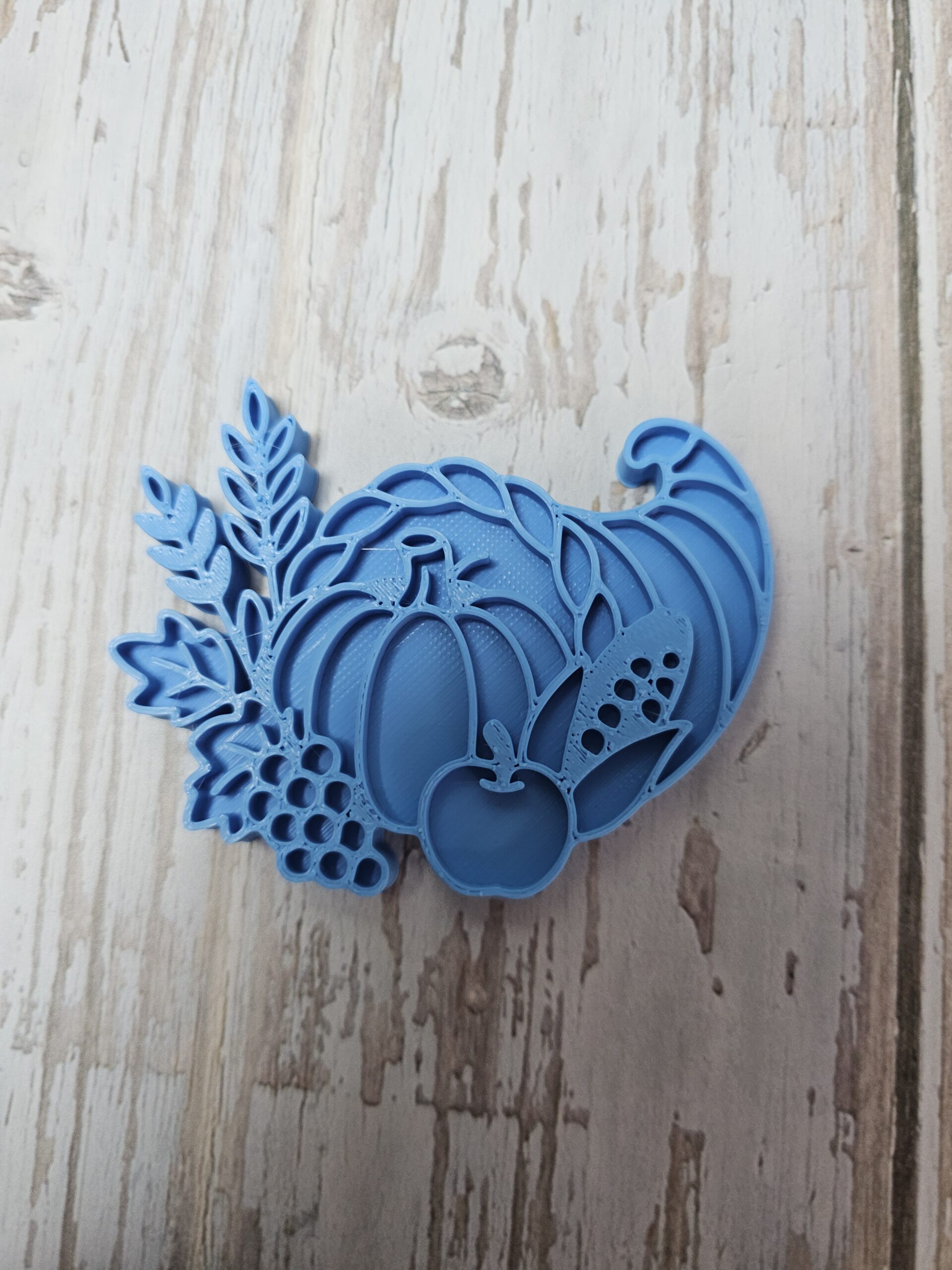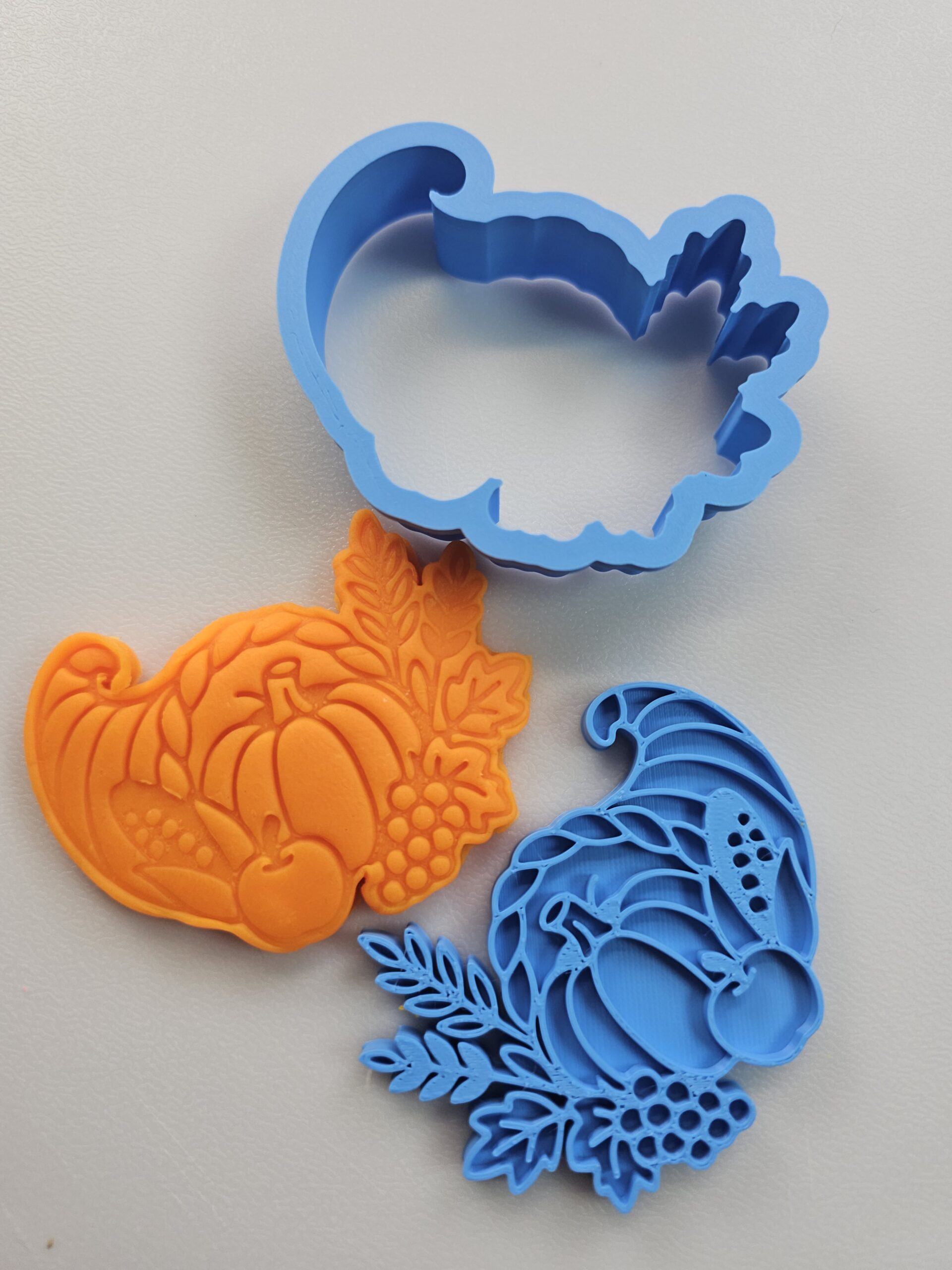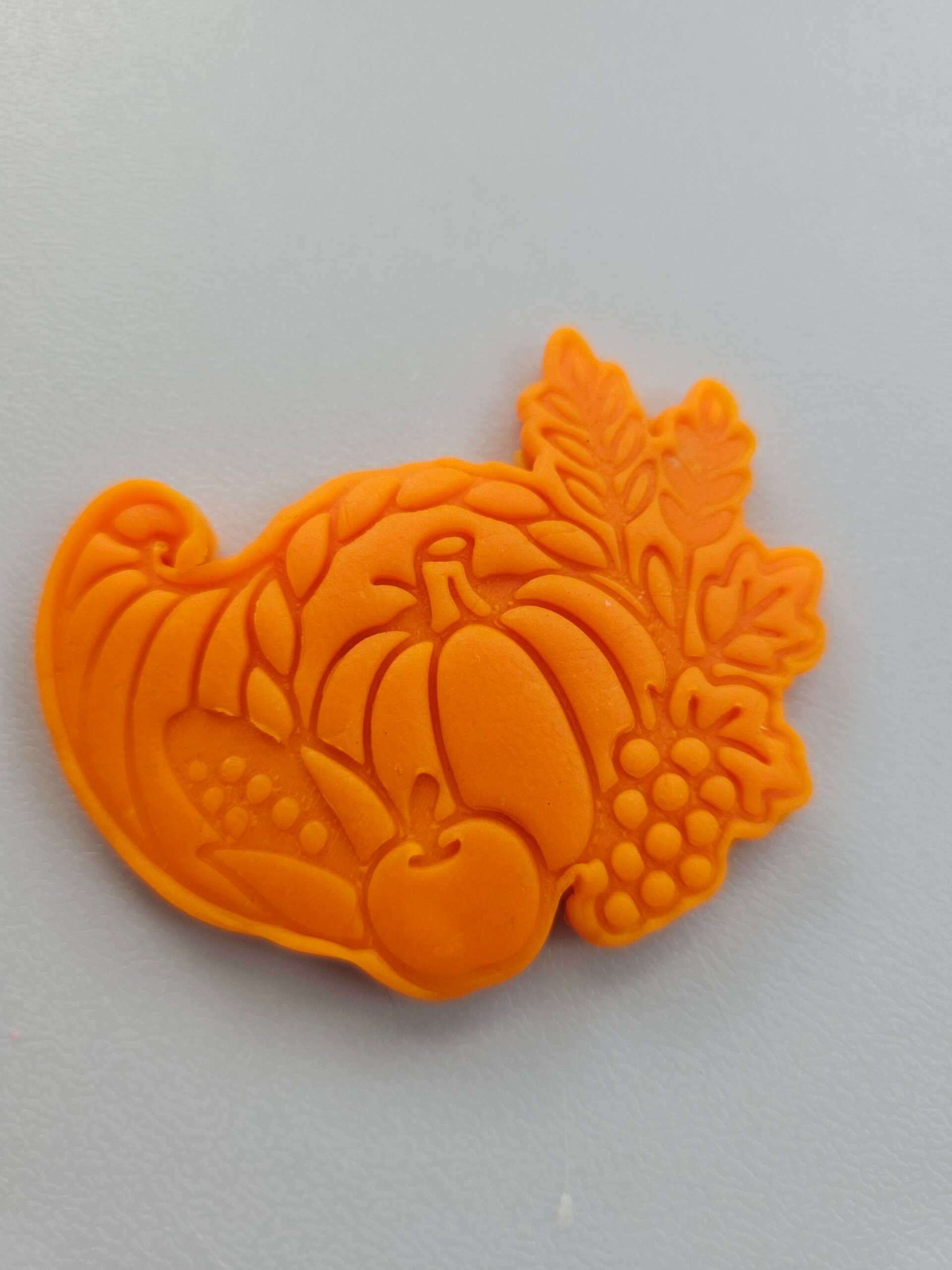 Celebrate abundance and gratitude with this Cornucopia Cookie Cutter & Stamp. Featuring a detailed horn of plenty filled with fruits and leaves, this design is perfect for Thanksgiving cookie sets, autumn gatherings, and festive baking projects.