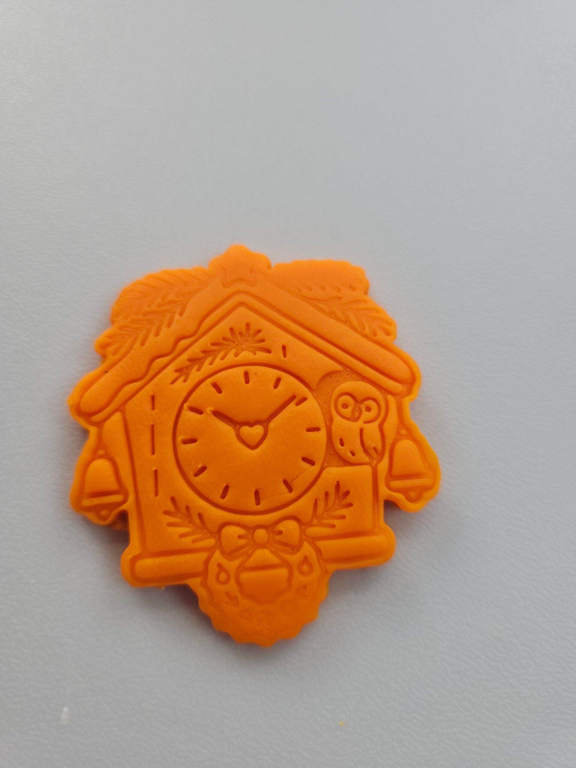 • Cutter with Stamp Only – Cuts the cuckoo clock shape and embosses detailed elements like the clock face, bird, roof, and pendulum. The stamp can be used directly on cookie dough or fondant to decorate the top of the cookie.