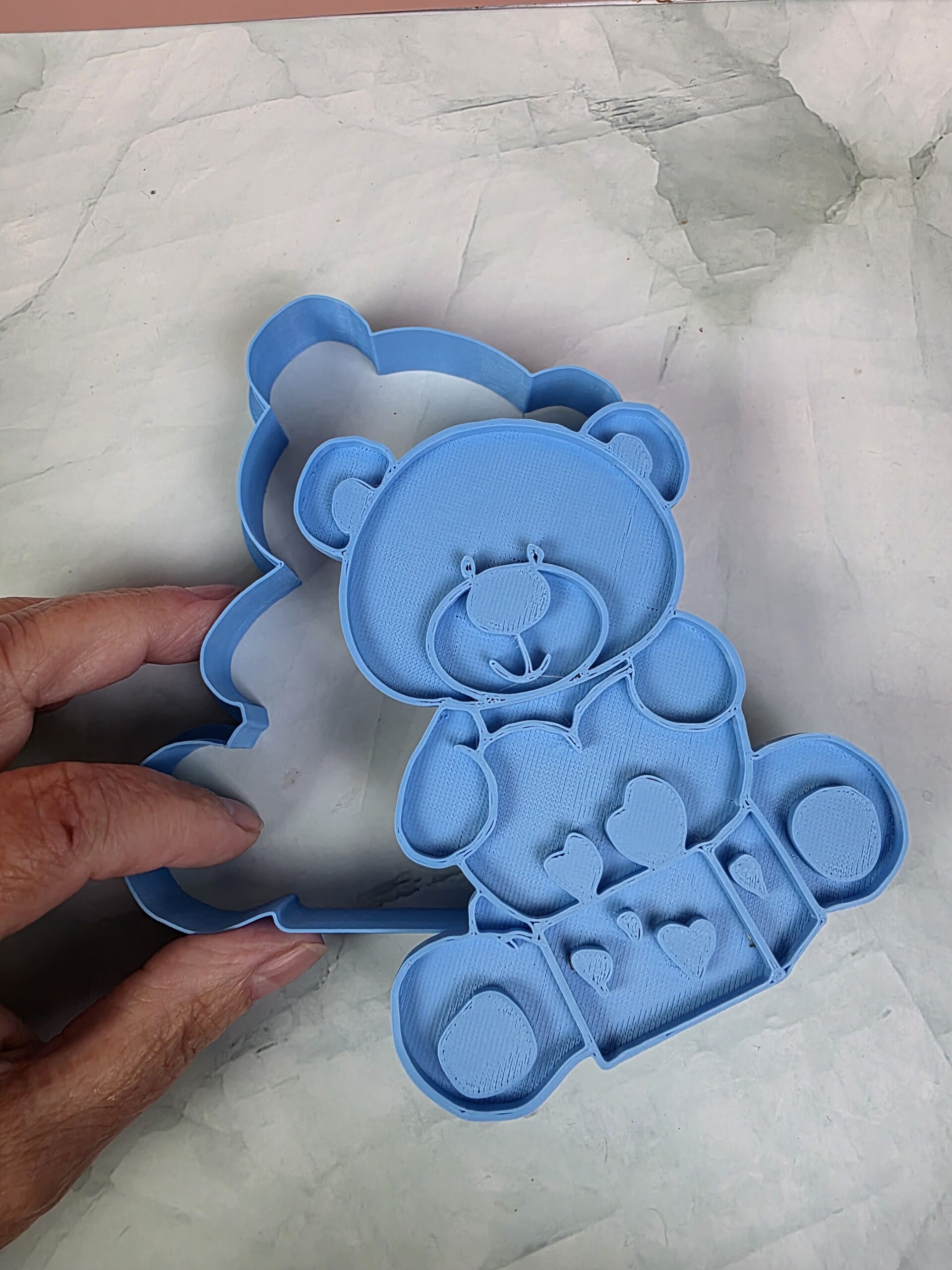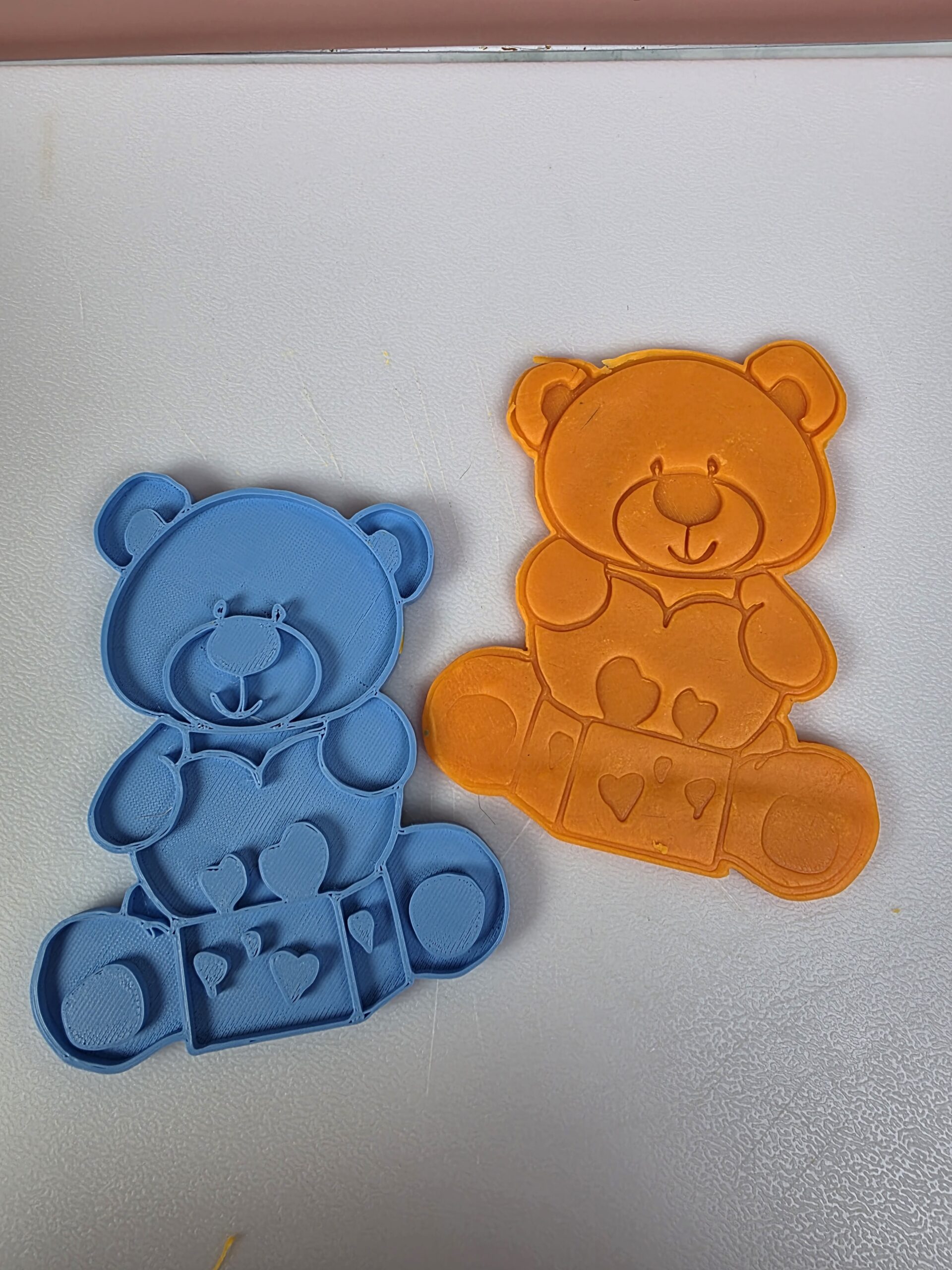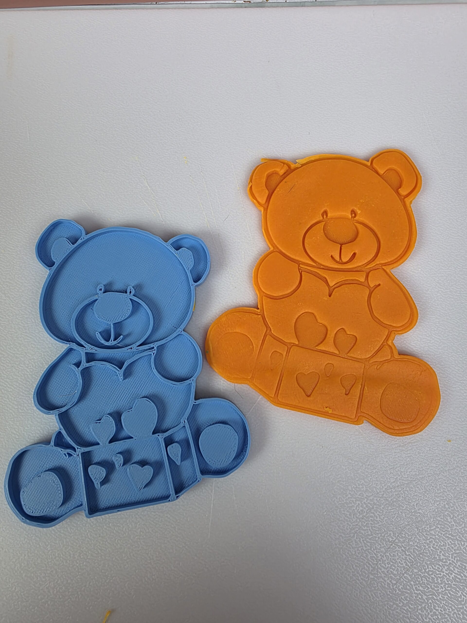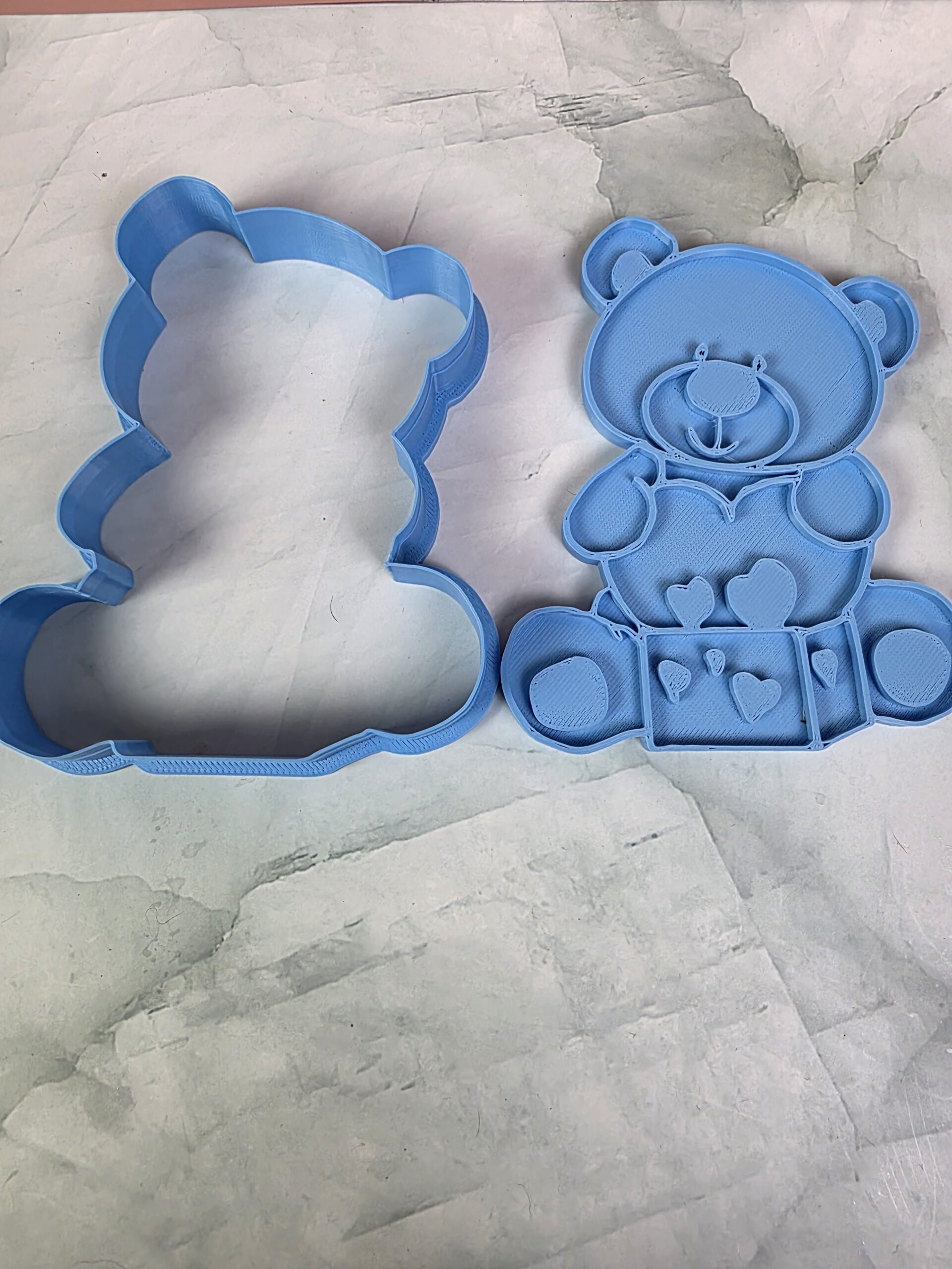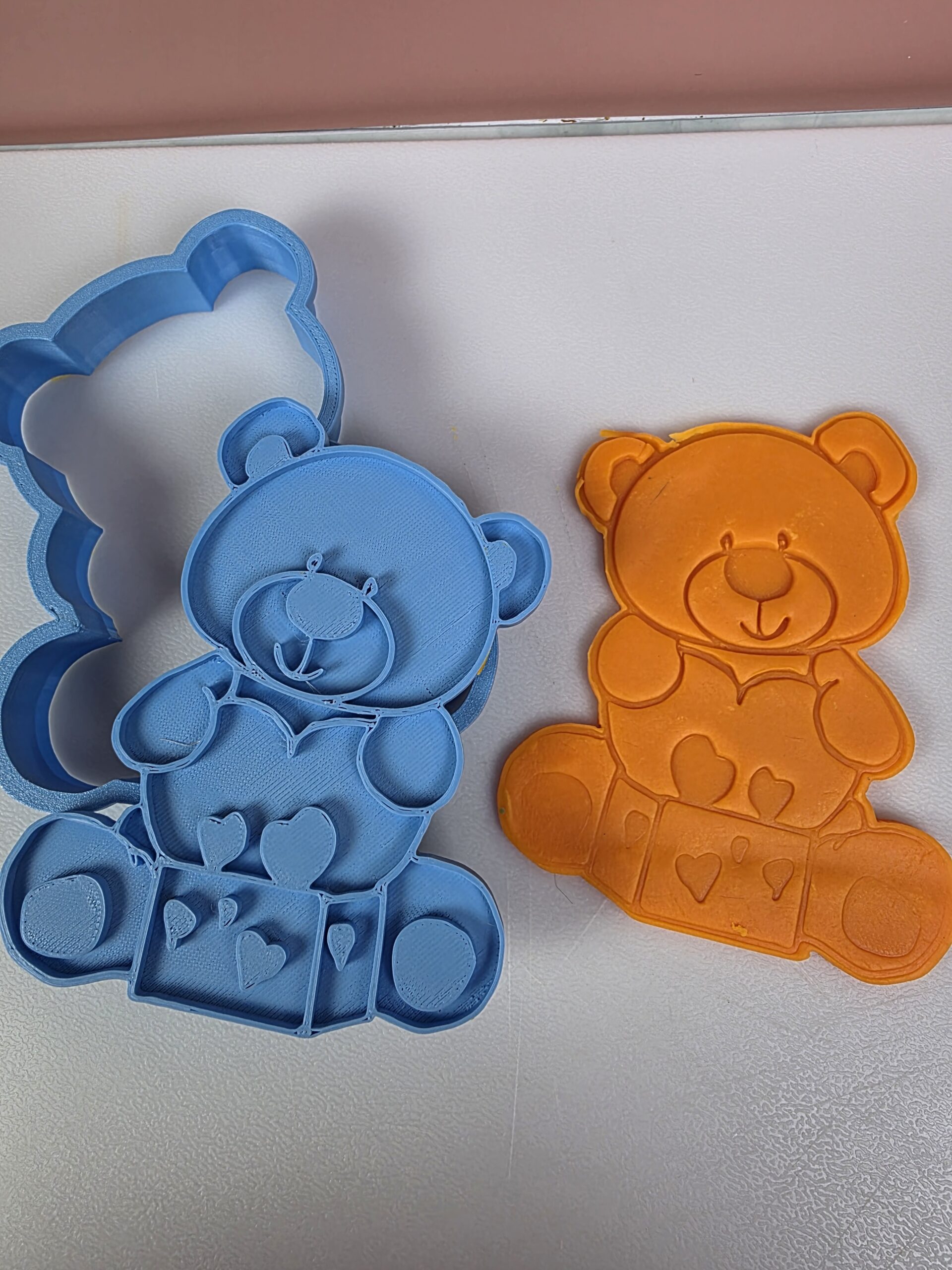• Cutter with Stamp Only – Cuts the teddy bear shape and embosses details such as the gift box, heart, facial features, and paws. The stamp can be used directly on cookie dough or fondant to decorate the top of the cookie.