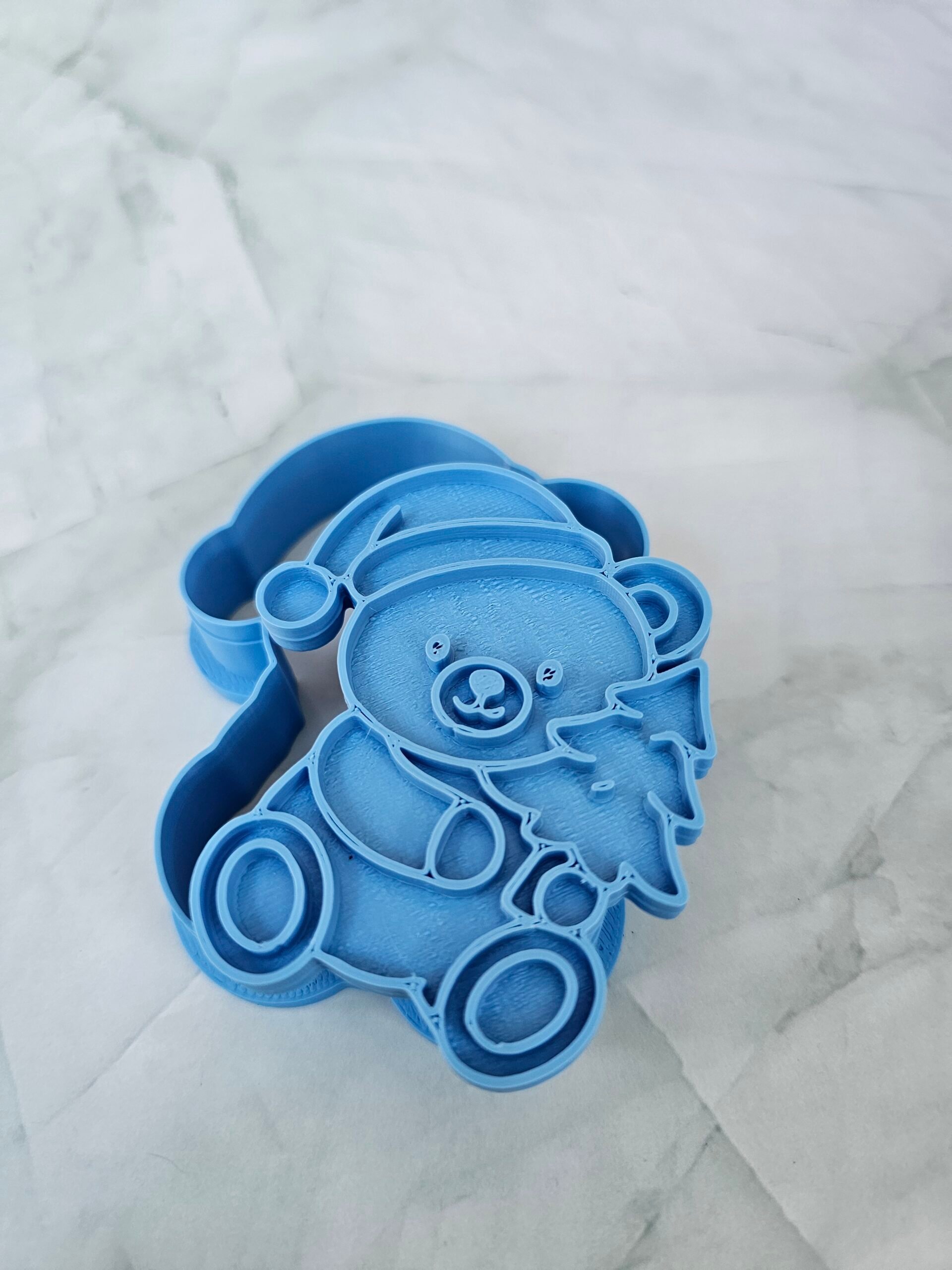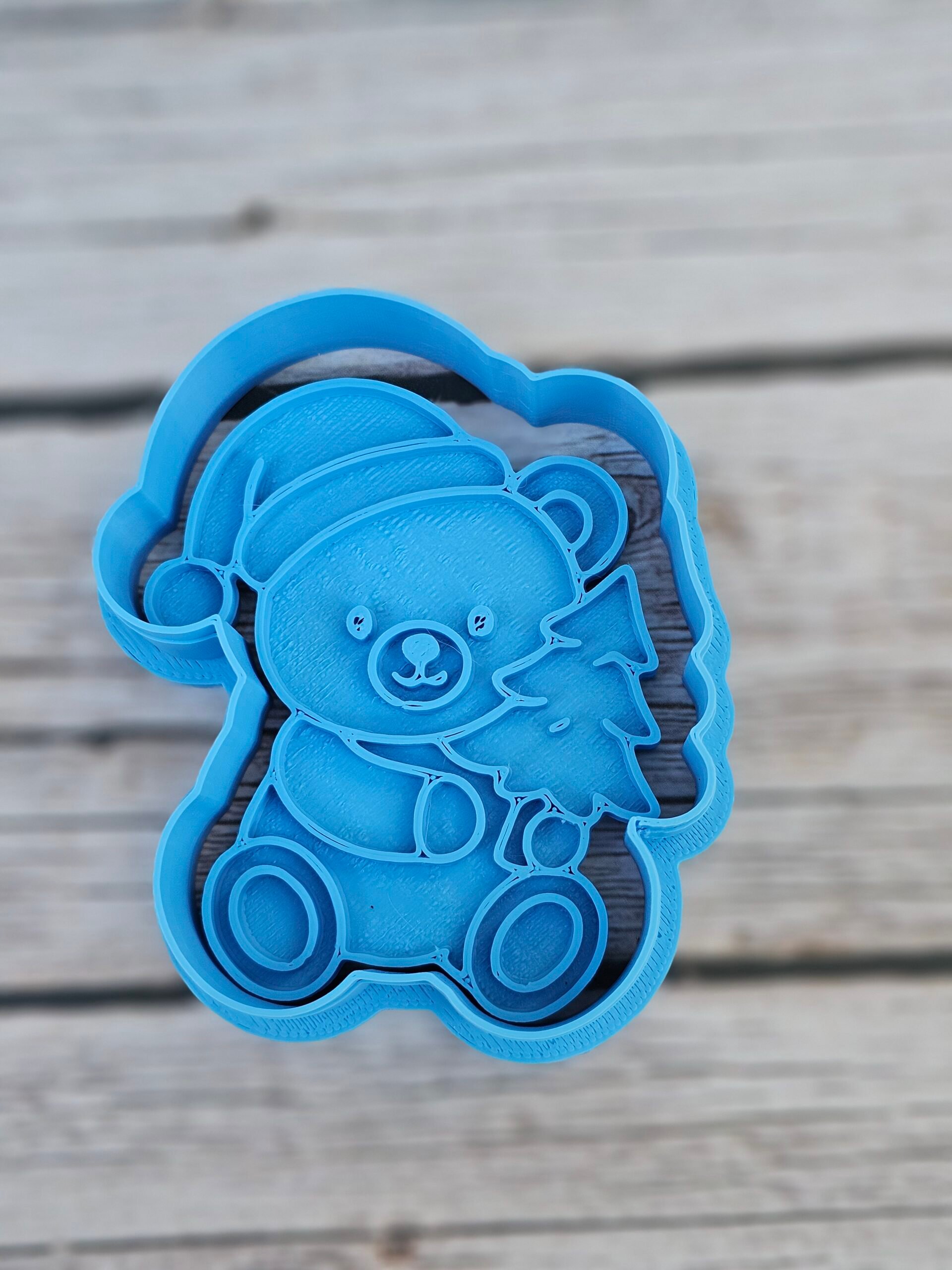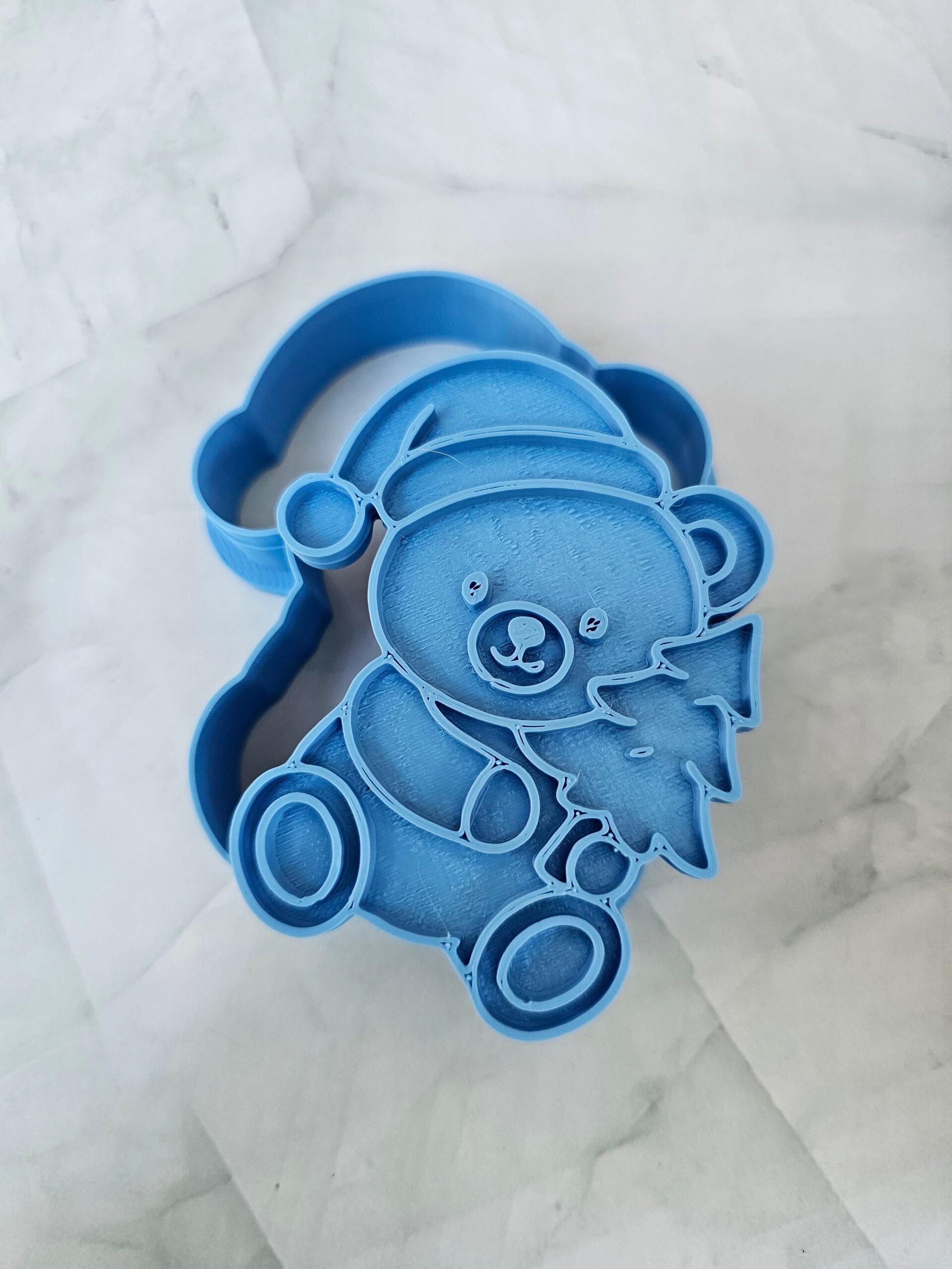 Teddy Bear Holding Christmas Tree Cookie Cutter – Holiday Series – 3” and 4.75” Sizes – Stamp or Imprint