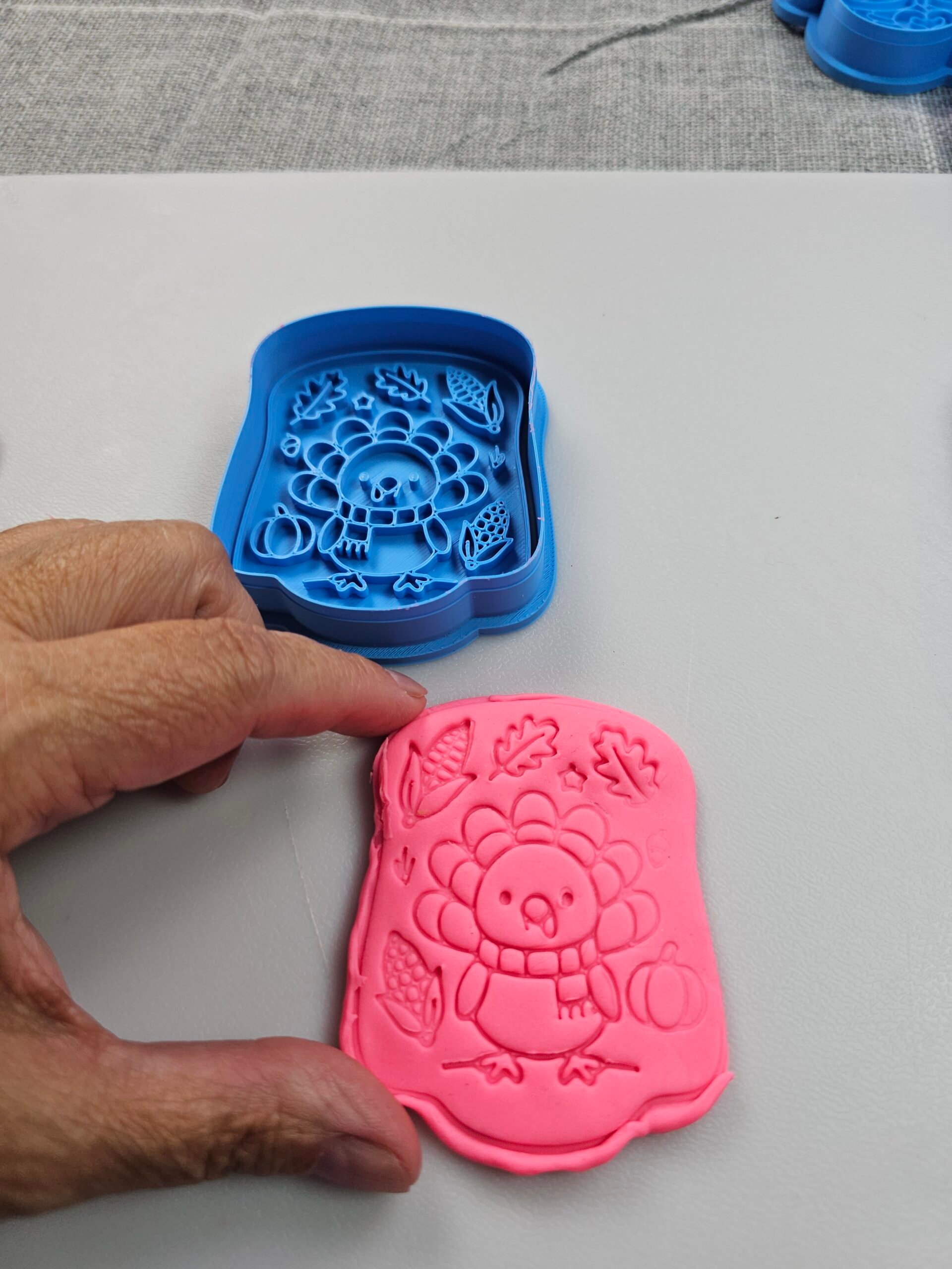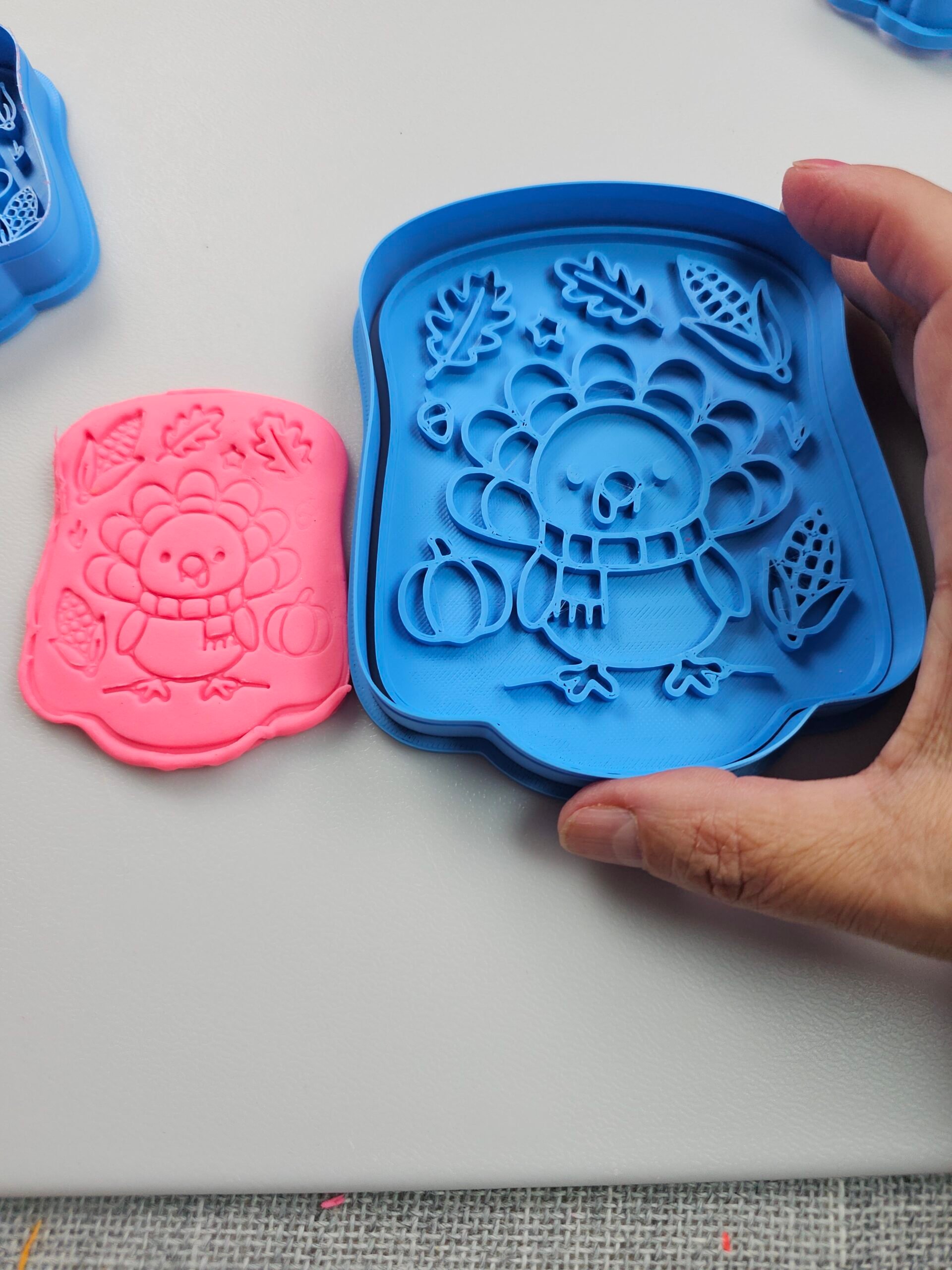 • Cutter with Stamp Only – Cuts the turkey shape and embosses details such as feathers, beak, and wings. The stamp can be used directly on cookie dough or fondant to decorate the top of the cookie.