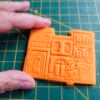 • Cortador con Sello Únicamente – Corta la forma de las tres casas y graba los detalles navideños, puertas y ventanas. El sello se puede usar directamente sobre la masa o fondant para decorar la parte superior de la galleta.