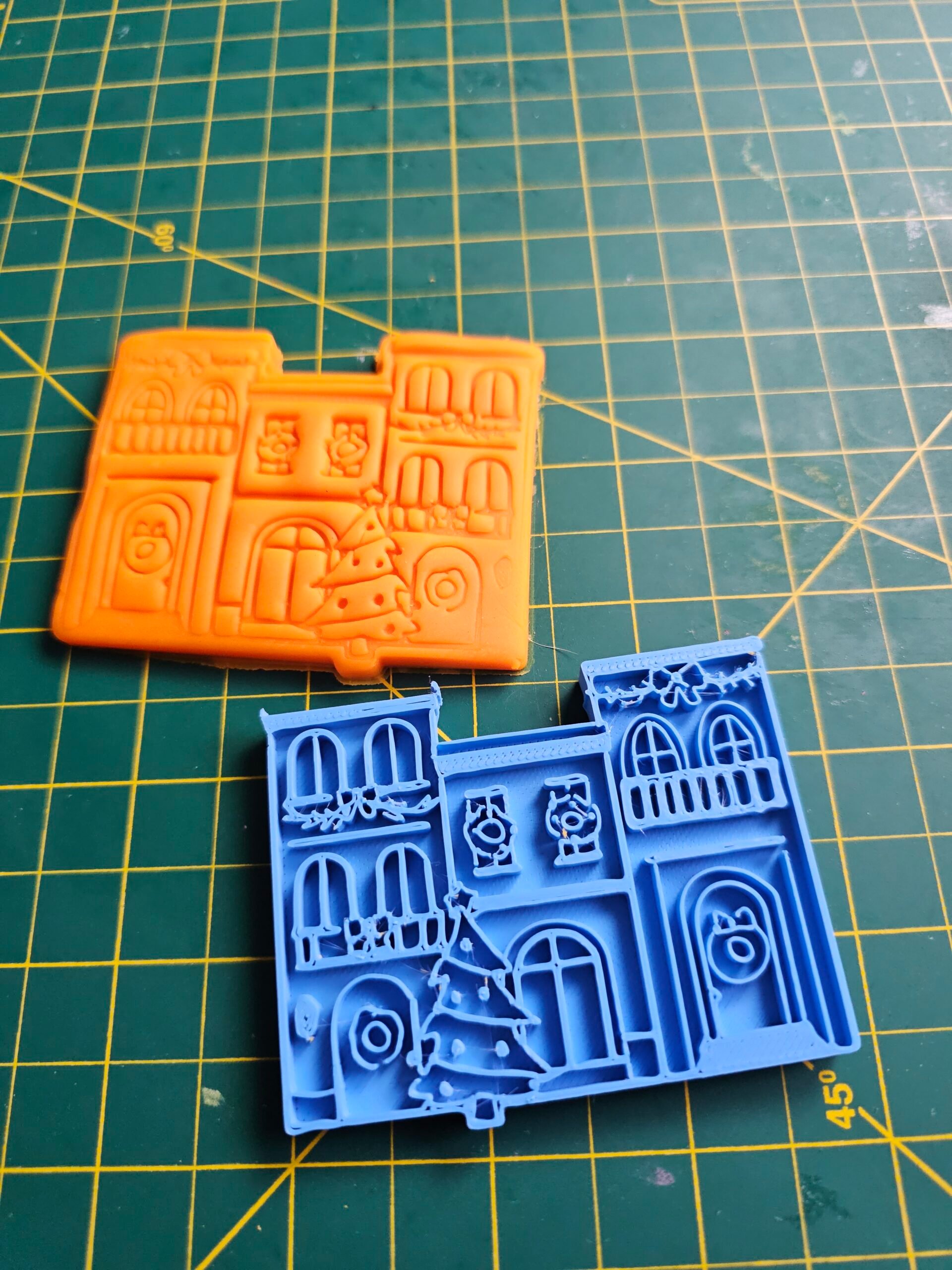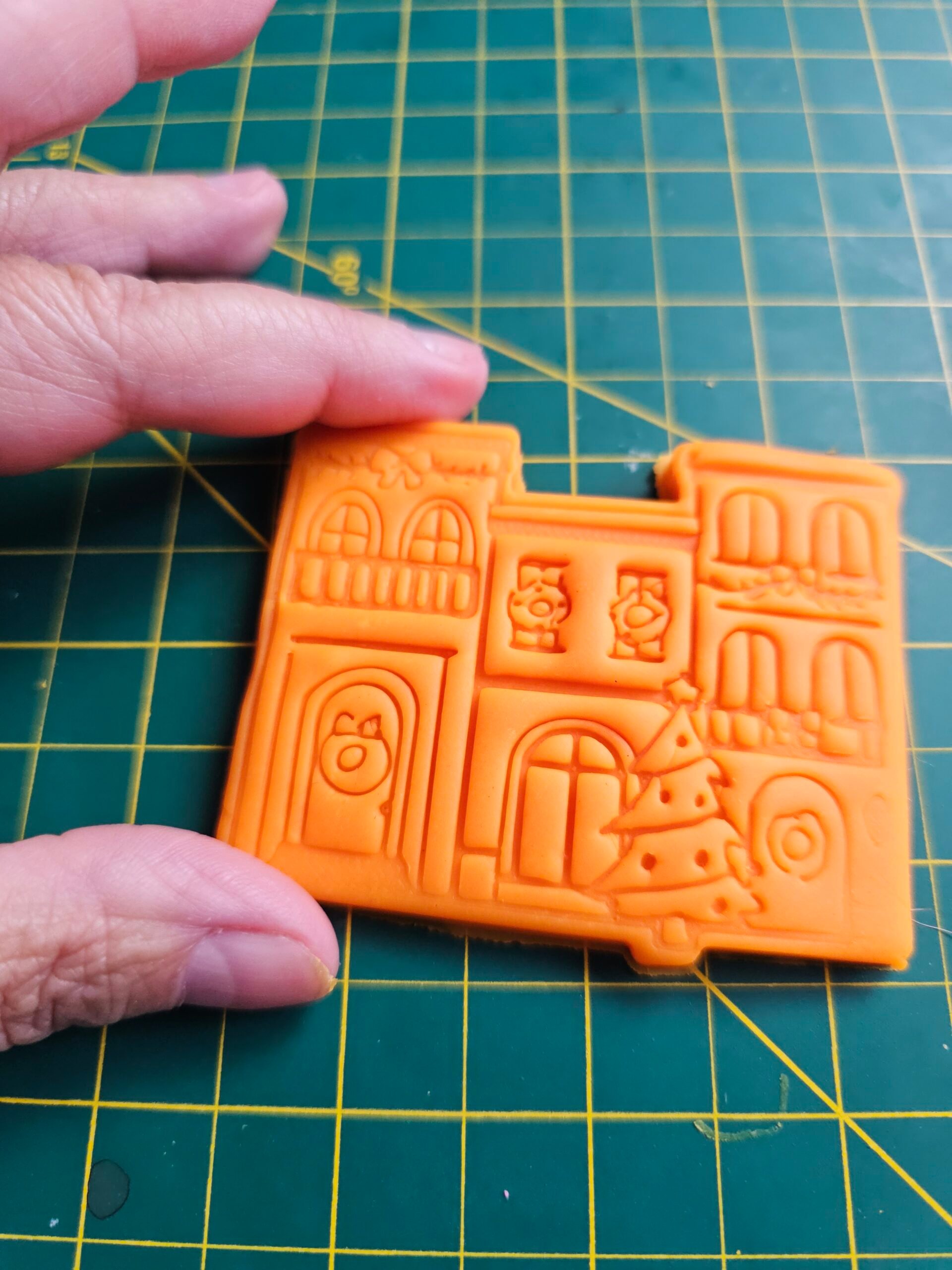 • Cutter with Stamp Only – Cuts the shape of the three connected houses and embosses the Christmas decorations, doors, and windows. The stamp can be used directly on cookie dough or fondant to decorate the top of the cookie.