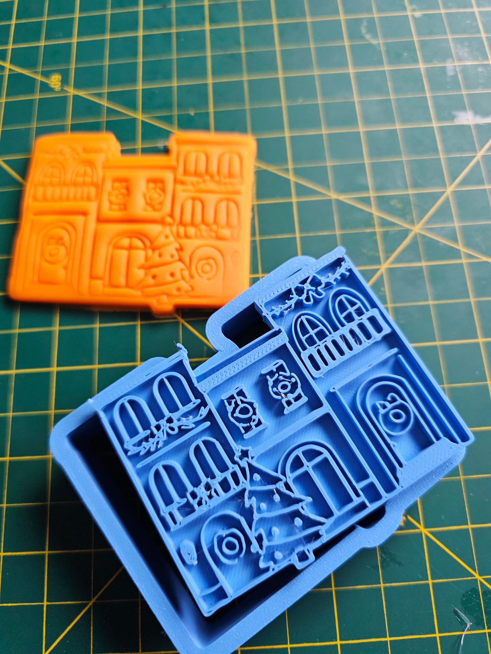 • Cortador con Sello Únicamente – Corta la forma de las tres casas y graba los detalles navideños, puertas y ventanas. El sello se puede usar directamente sobre la masa o fondant para decorar la parte superior de la galleta.